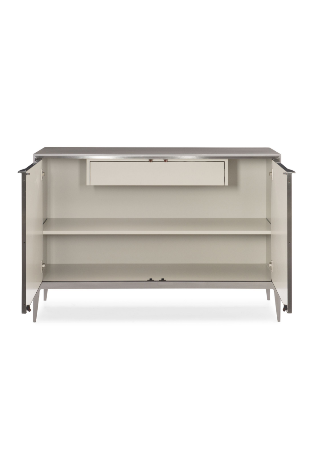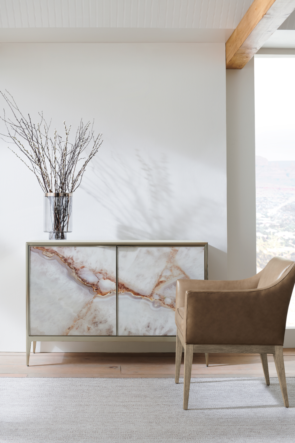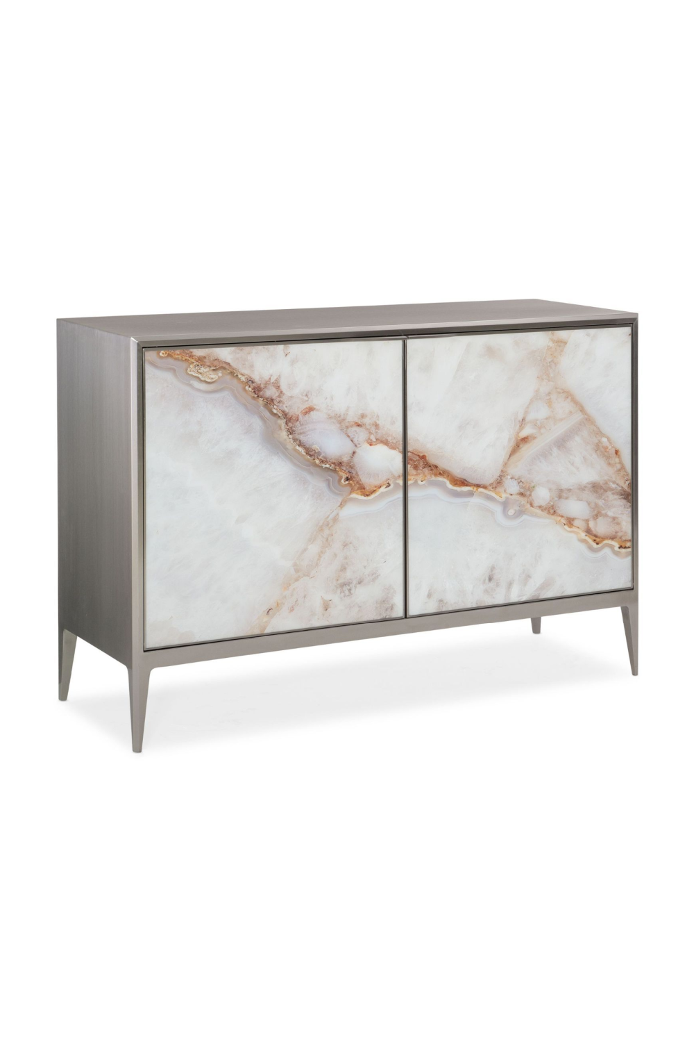 Ejemplo perfecto de la belleza de la naturaleza, el armario Rock Steady confiere un carácter moderno a cualquier espacio. Envuelta en un marco metálico realzado con un acabado en Níquel cepillado, sus dos puertas de vidrio presentan un patrón único de ágata pintado en una paleta de colores blancos y grises fríos salpicados por tonos terrosos de terracota. Sutiles tiradores añaden funcionalidad sin restar brillo a su diseño. En el interior, encontrarás un espacio de almacenamiento completamente acabado en Putty con una estantería ajustable y un cajón de almacenamiento. Las patas estilizadas completan el look de esta pieza a la moda.