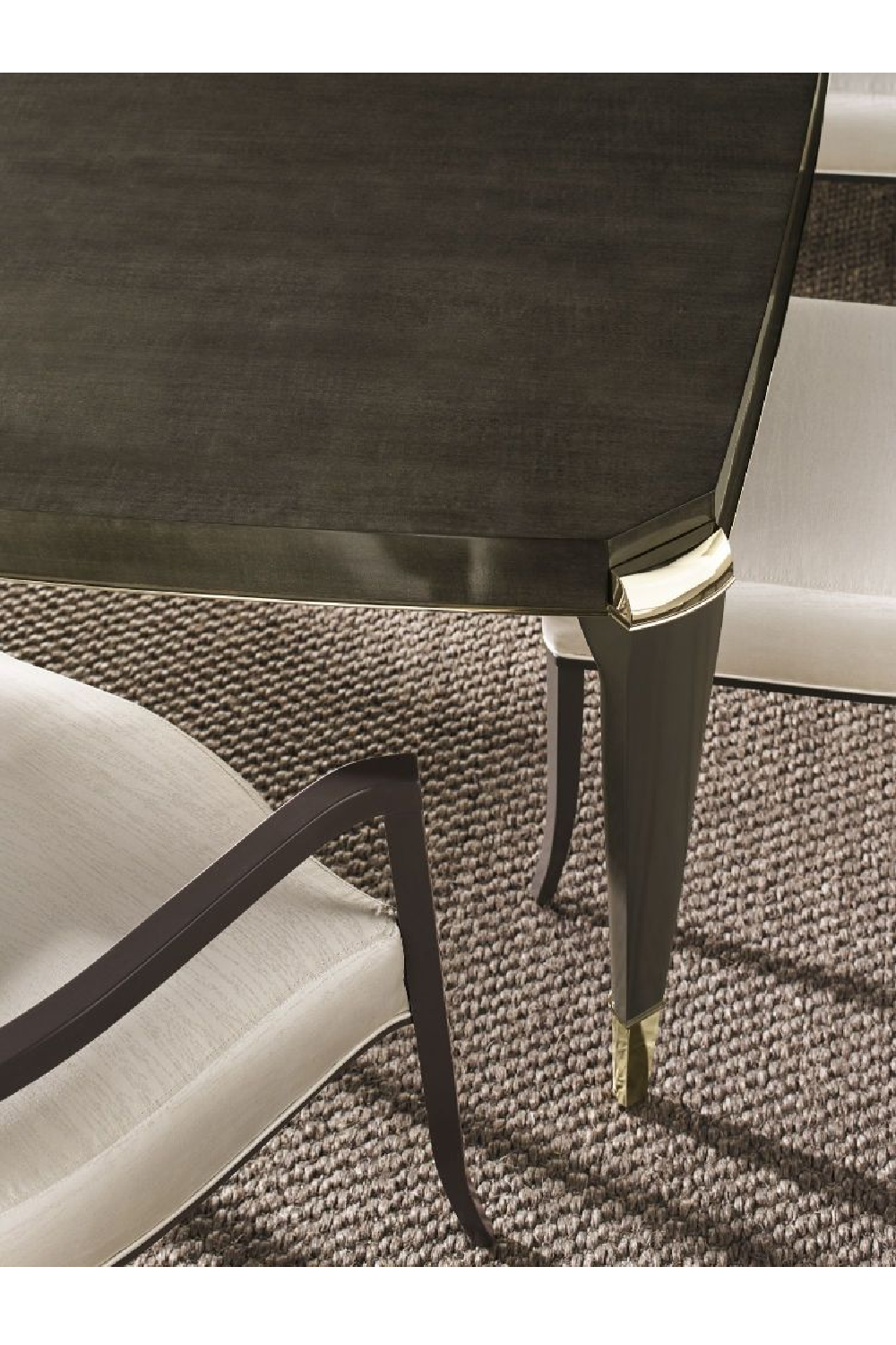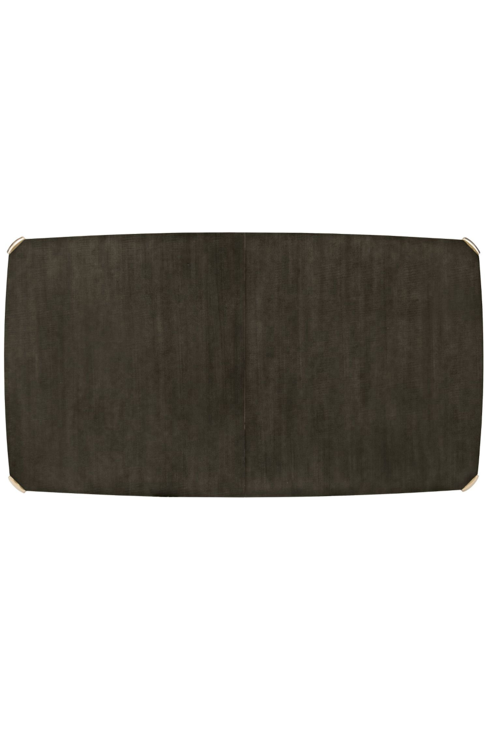 Para las grandes comidas, esta mesa de madera de anegre no tiene igual. La madera delicadamente veteada, en una forma rectangular curvada, tiene esquinas biseladas graciosamente detalladas con tapas de metal estirado, Whisper of Gold. Todo el faldon esta bordeado con una fina perla Whisper of Gold mientras descansa sobre patas cabriola modernas con virolas doradas personalizadas. Para una cena en su mejor version, esta pieza es extensible y se alarga de 210 cm a 312 cm con dos extensiones de 50 cm cada una.