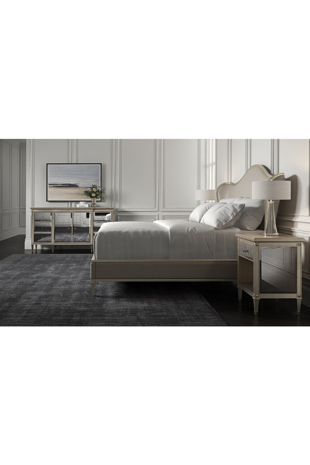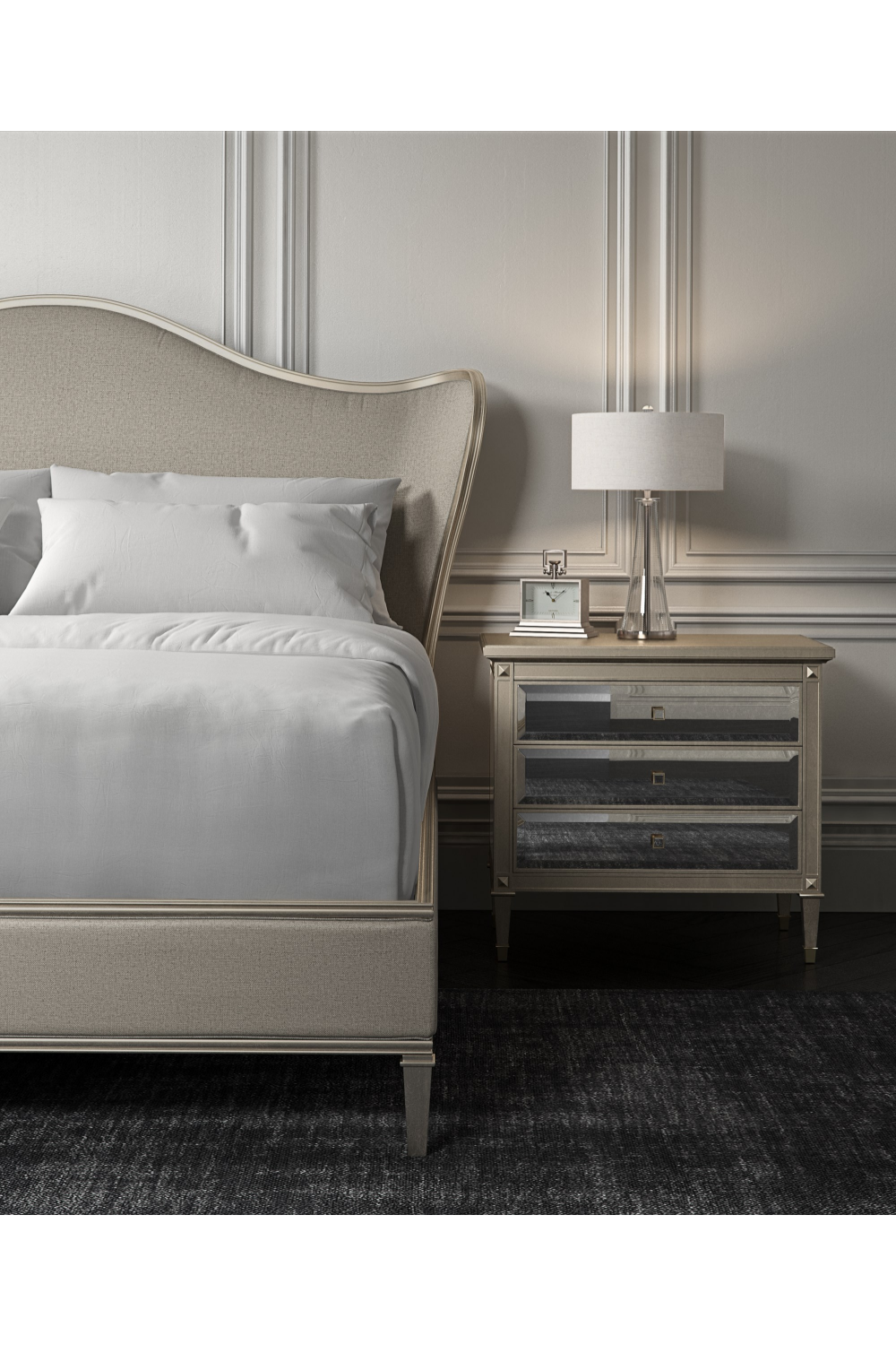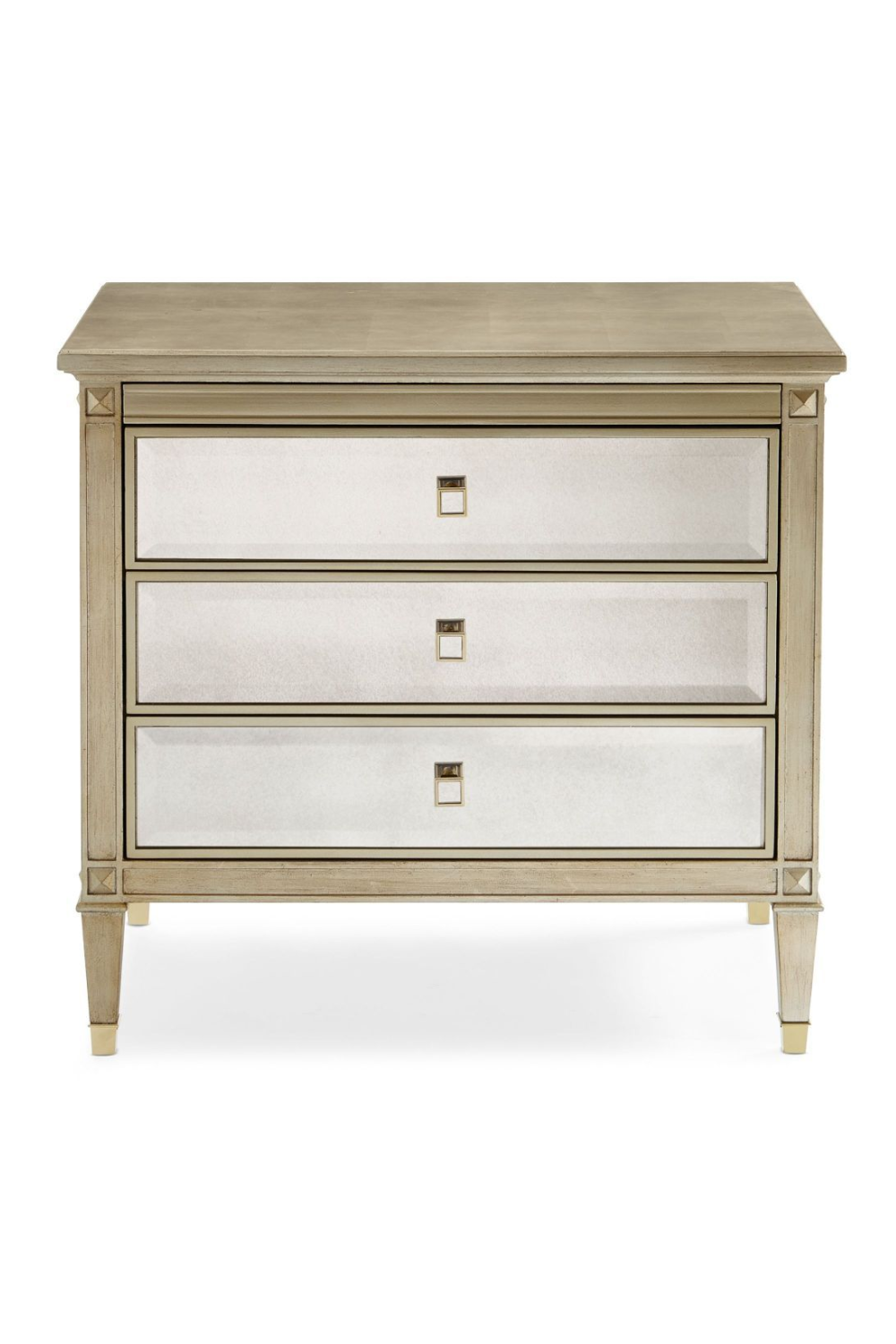 Esta mesita de noche es un bello reflejo de tu estilo. La estructura representa una interpretación moderna del diseño lineal italiano con el añadido de un acabado brillante en hoja de plata Auric y frentes de espejo biselado antiguo. Esta cómoda esculpida incluye tres cajones con cierre suave y tiradores cuadrados personalizados de metal/espejo. El interior está acabado con pintura Gold Bullion brillante. Las patas cuadradas y afiladas, bellamente esculpidas con embellecedores metálicos, hacen de esta pieza una opción majestuosa para colocar junto a una cama lujosa.