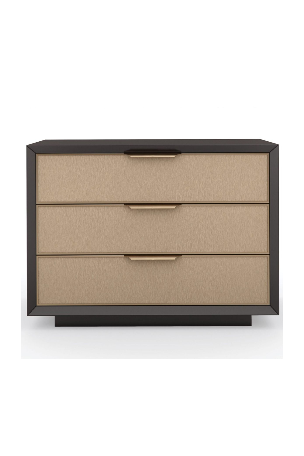 Un brillante compañero de mesita de noche, esta mesa de noche con líneas puras fusiona el minimalismo con elementos de diseño moderno de mediados de siglo. Enmarcados en un acabado de chocolate negro contrastante, tres cajones con cierre suave presentan fachadas de vinilo texturizado, en relieve con un patrón de arroyo como la lluvia que corre sobre un cristal. Difundiendo un resplandor cálido, el acabado en metal Champagne Gold integra astutamente tiradores redondeados para enmarcar cada cajón de manera homogénea. Dispone de un puerto USB en la parte trasera a lo largo del sobre para facilitar la carga.