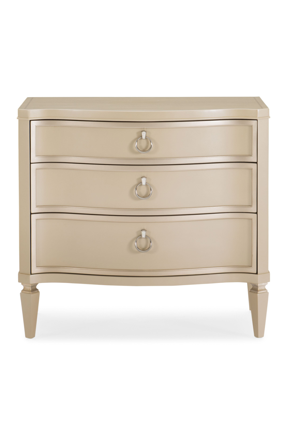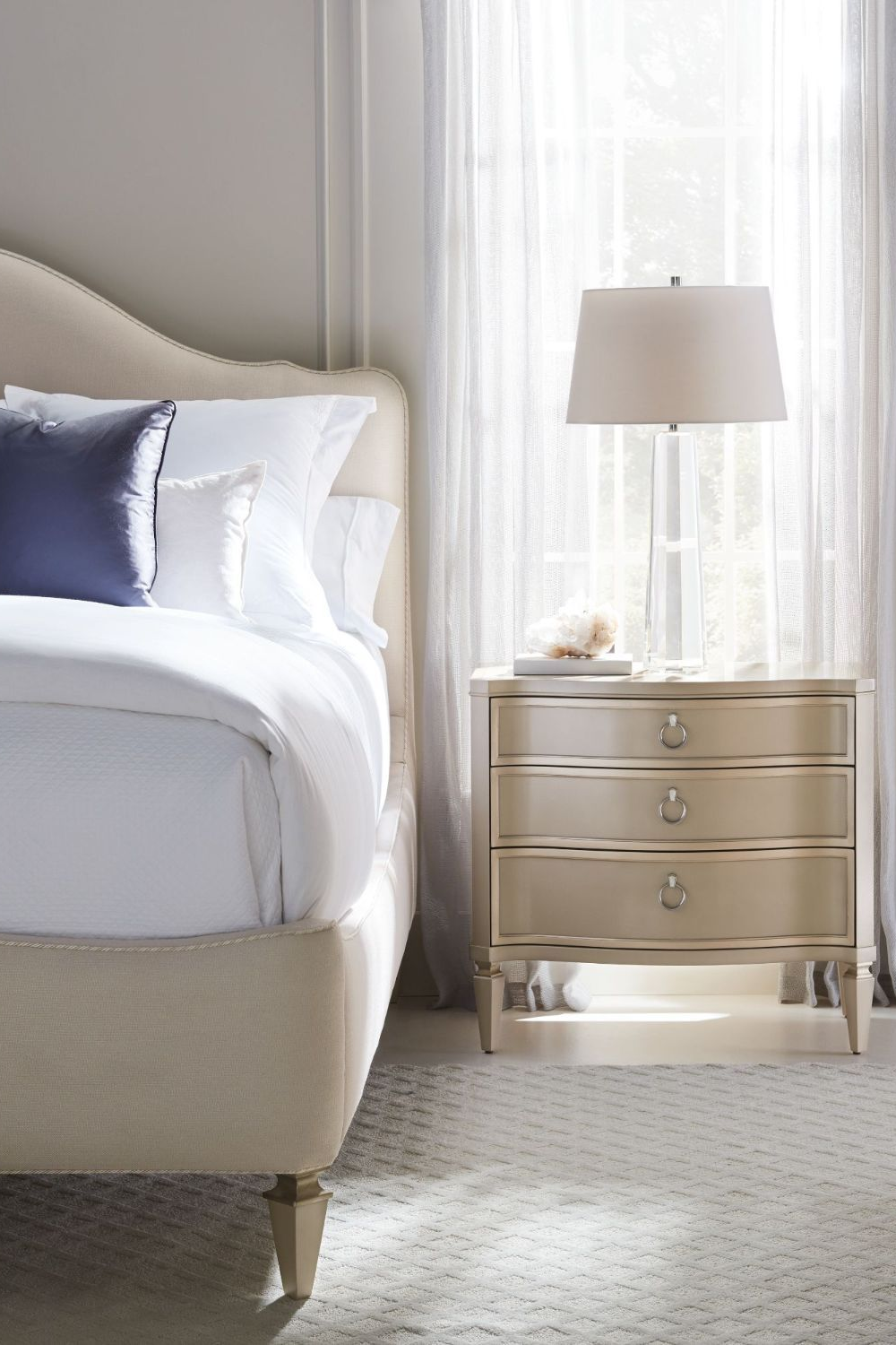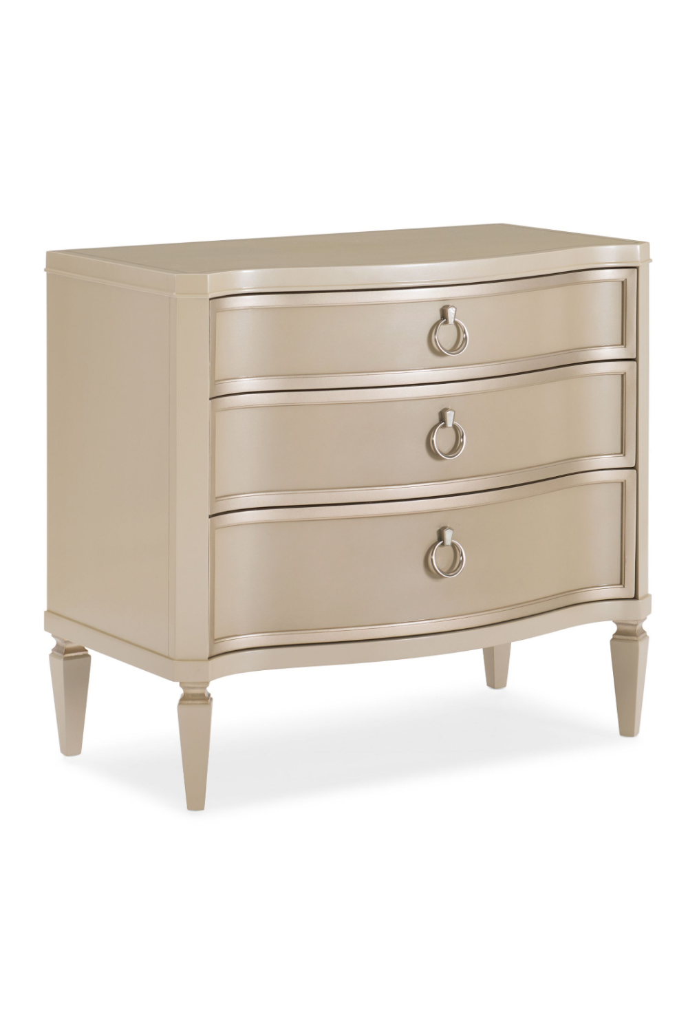 Seductora en todos los sentidos, esta mesilla de noche de inspiración francesa aporta un encanto inesperado al lado de la cama. Cuenta con una tapa moldeada con un bonito diseño serigrafiado y tres cajones de almacenamiento con cierre amortiguado de generoso tamaño. Con un lujoso acabado Radiant Pearl, luce reflejos Sparkling Argent en algunas molduras. Para una mesilla de noche clásica pero actualizada, esta pieza no tiene equivalente.