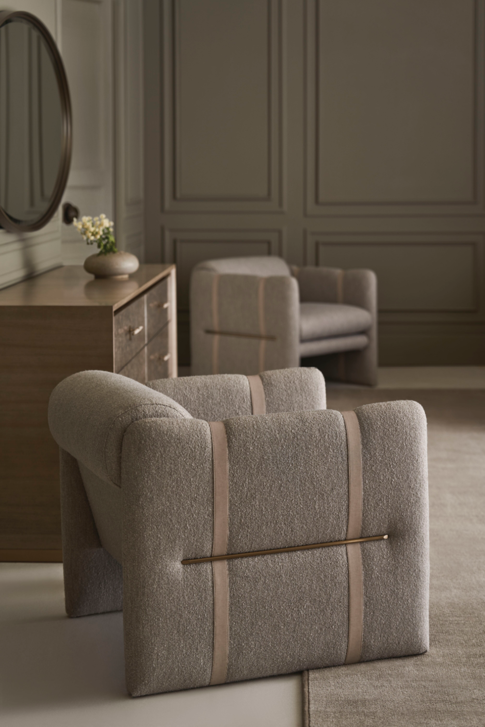 Una refinada combinación de materiales, la cómoda Hang Up fusiona la belleza de la madera con el atractivo del metal. Atrae la atención: los frentes de los cajones con un ambiguo pan de metal roto que adquiere el brillo de una ventana cubierta de escarcha e iluminada por velas. Un marco metálico empotrado añade profundidad y dimensión, complementado por tiradores cónicos envueltos en piel sintética cosida a mano, y acentuados con detalles en oro y níquel cepillados. Presenta interiores pintados en lino con divisores en el cajón superior y una bandeja para joyas extraíble.